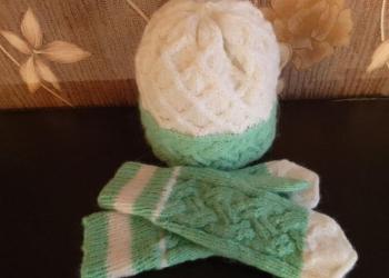 Полушерстяной комплект ручной вязки,- шапка двойная,варежки.Возможна отправка почтой России,с оплатой при получении.